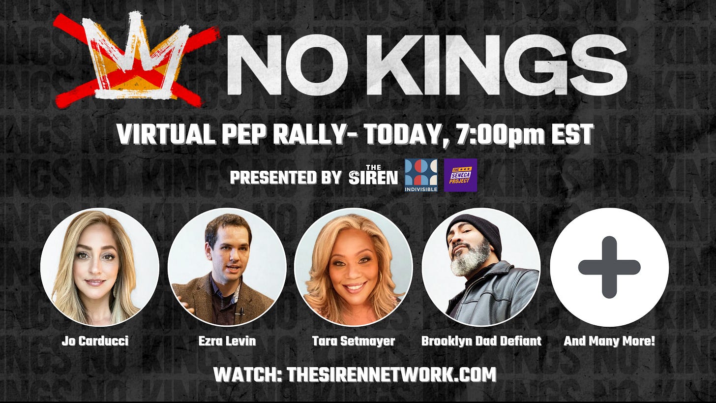 ALSO: Join us TONIGHT, right here on The Siren, for a virtual No Kings 3 pep rally with your favorite creators, organizers, leaders, and much more! You won’t want to miss this exciting livestream tonight at 7pm EST. We hope to see you there!